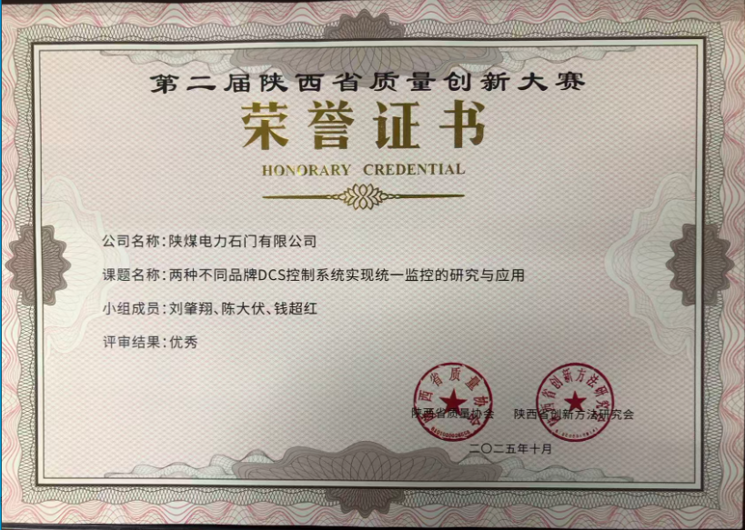 陜煤石電:《兩種不同品牌DCS控制系統(tǒng)實現(xiàn)統(tǒng)一監(jiān)控的研究與應(yīng)用》獲陜西省質(zhì)量創(chuàng)新大賽優(yōu)秀獎